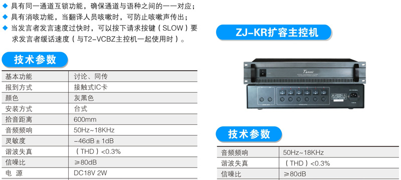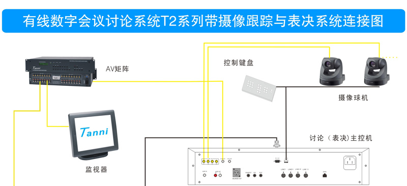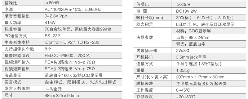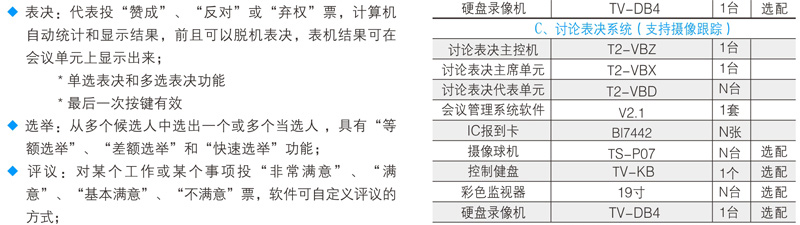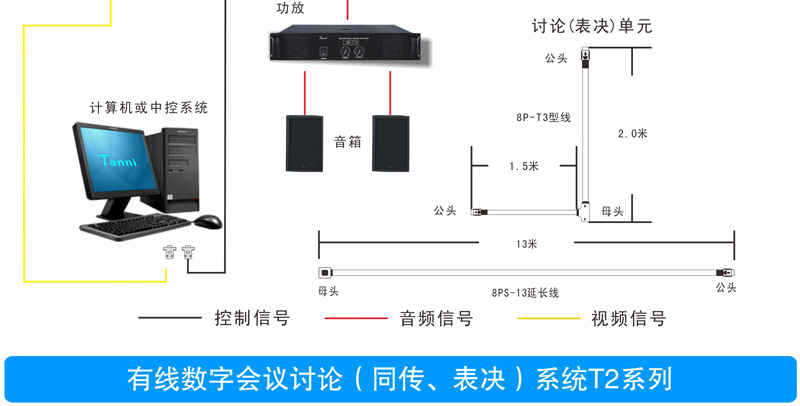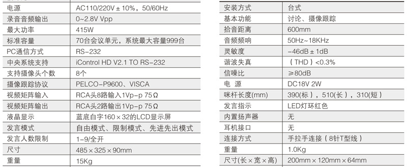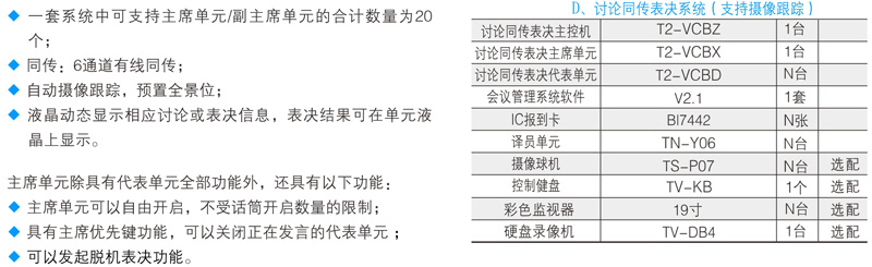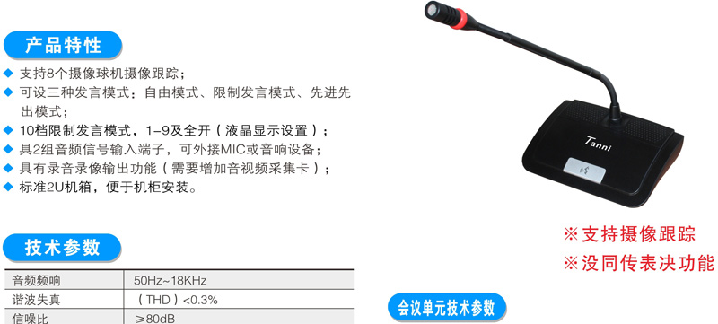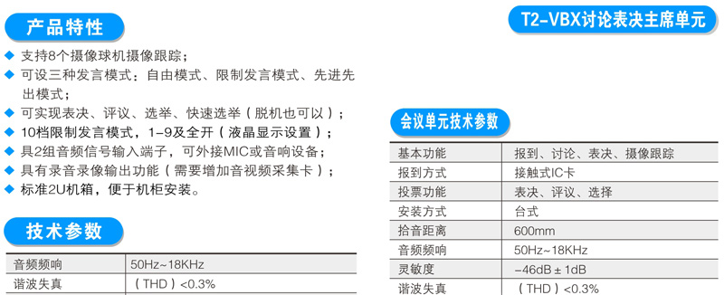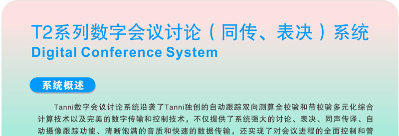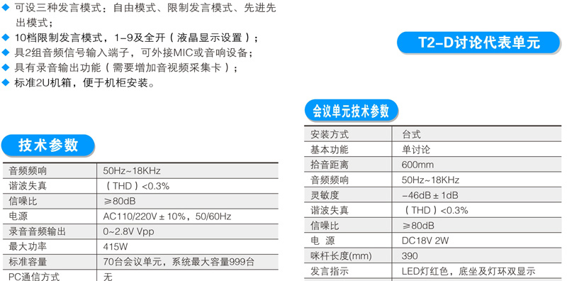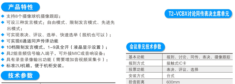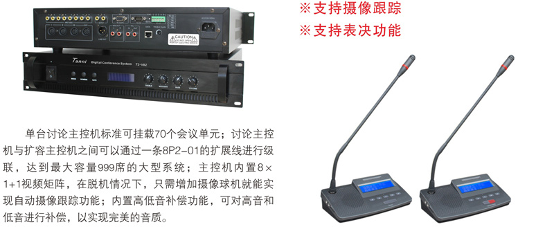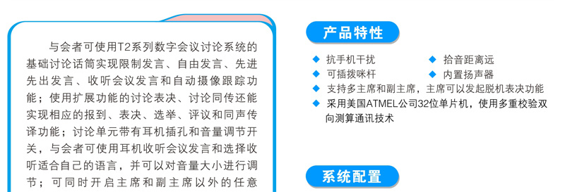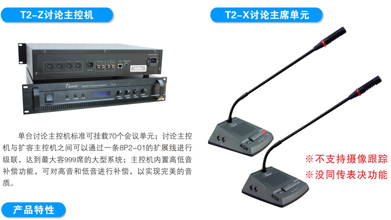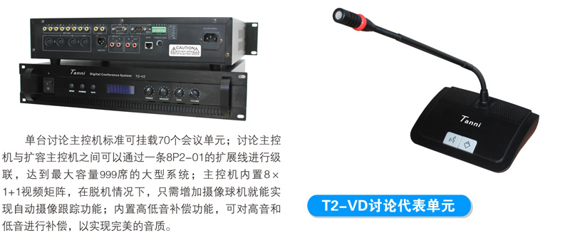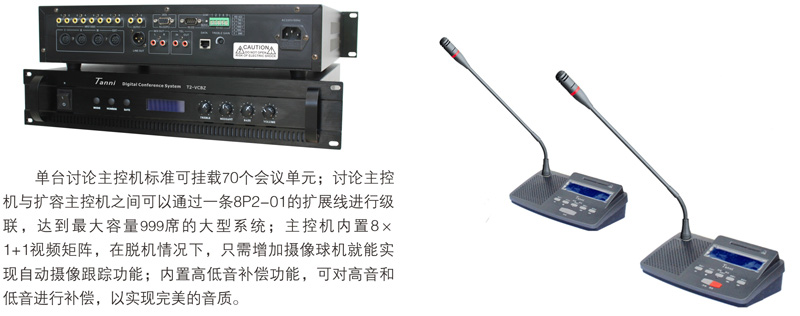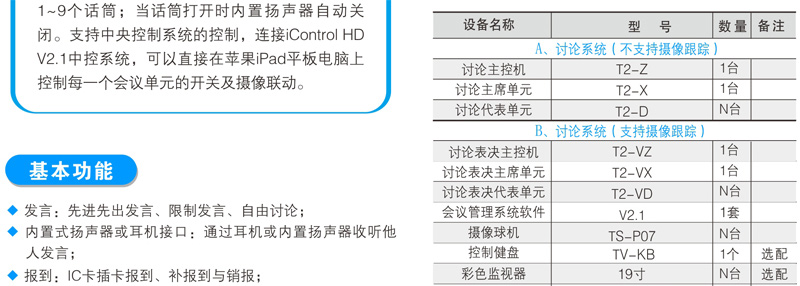与会者可使用T2系列数字会议讨论系统的基础讨论话筒实现限制发言、自由发言、先进先出发言、收听会议发言和自动摄像跟踪功能;使用扩展功能的讨论表决、讨论同传还能实现相应的报到、表决、选举、评议和同声传译功能;讨论单元带有耳机插孔和音量调节开关,与会者可使用耳机收听会议发言和选择收听适合自己的语言,并可以对音量大小进行调节;可同时开启主席和副主席以外的任意1~9个话筒;当话筒打开时内置扬声器自动关闭。支持中央控制系统的控制,连接iControl HD V2.1中控系统,可以直接在苹果iPad平板电脑上控制每一个会议单元的开关及摄像联动。