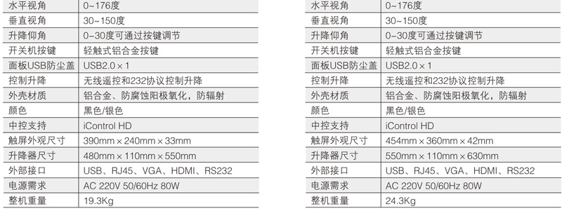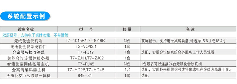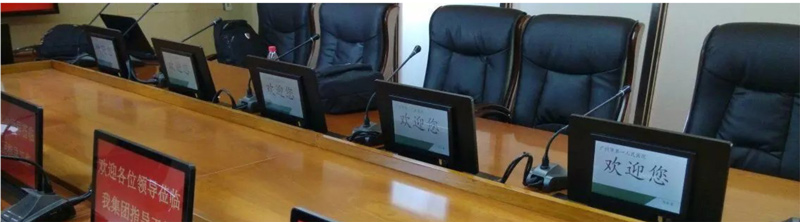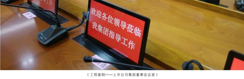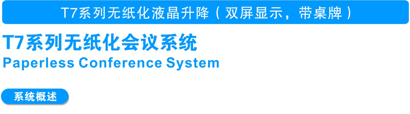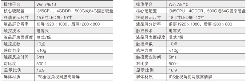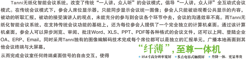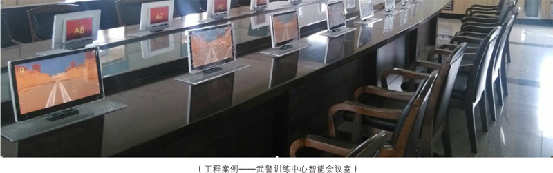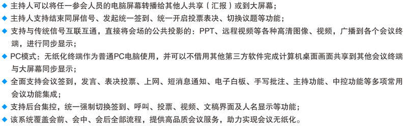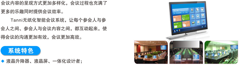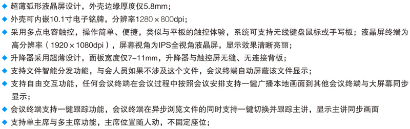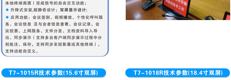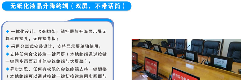 15.6寸和18.4寸双屏升降式安装,超静音设计。 一体化设计、铝合金CNC成型。 电容式10点触摸,1080P高清显示。 应用功能:会议签到、视频播放、个性化呼叫服务、会议信息 及与会者信息查看、会议记录、会议投票、上网服务、文件分发、文档资料导入导出、同步演示(支持多台客户端同步演示过程中分别批注、保存,支持同步至投影幕或其他终端),支持功能自定义。