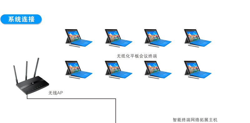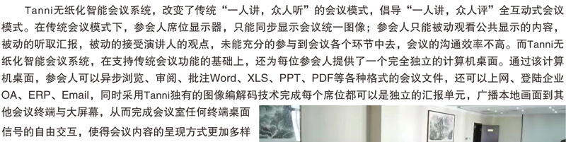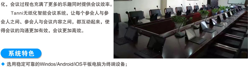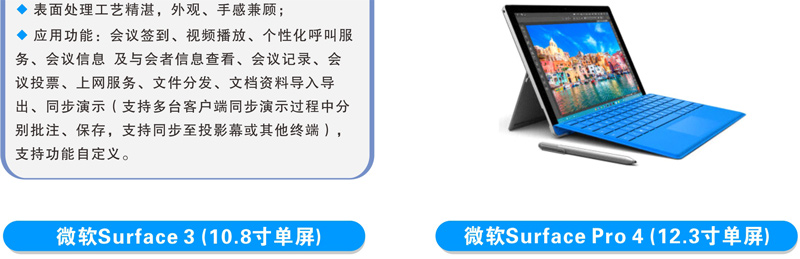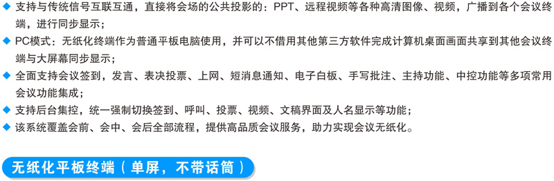 平板式Windows/Android/iOS平板电脑为终端设备,一体化设计、X86构架;电容式10点触摸,1080P/2K/4K高清显示。 应用功能:会议签到、视频播放、个性化呼叫服务、会议信息 及与会者信息查看、会议记录、会议投票、上网服务、文件分发、文档资料导入导出、同步演示(支持多台客户端同步演示过程中分别批注、保存,支持同步至投影幕或其他终端),支持功能自定义。
