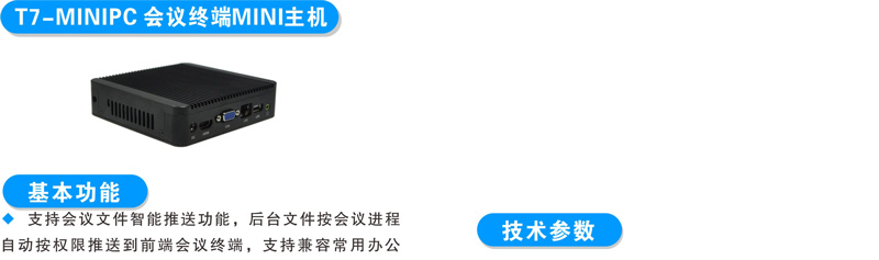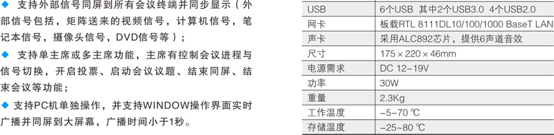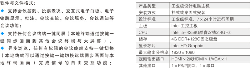 支持会议文件智能推送功能,后台文件按会议进程自动按权限推送到前端会议终端,支持兼容常用办公软件与文件格式;支持会议签到、投票表决、交互式电子白板、电子铭牌显示、批注、会议交流、会议服务、会议通知等会议功能;支持任何会议终端一键同屏(本地终端通过按键一键同步画面到其他会议终端与大屏幕)。