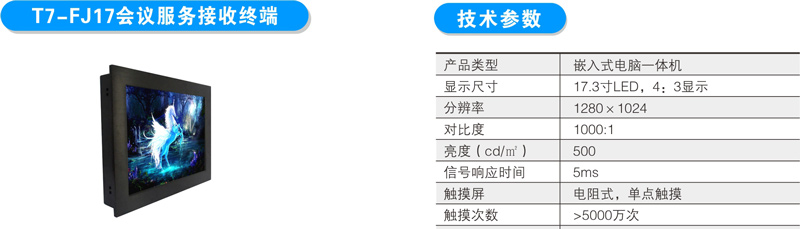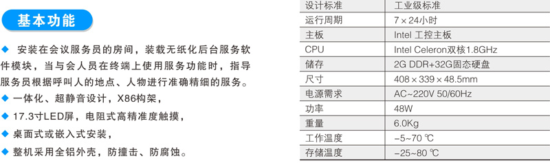 安装在会议服务员的房间,装载无纸化后台服务软件模块,当与会人员在终端上使用服务功能时,指导服务员根据呼叫人的地点、人物进行准确精细的服务。一体化、超静音设计,X86构架,17.3寸LED屏,电阻式高精准度触摸,桌面式或嵌入式安装,整机采用全铝外壳,防撞击、防腐蚀。