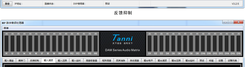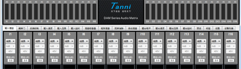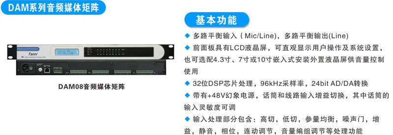 基于超级强大的ADSP-21489超级强大的DSP处理能力,以及基于我们独特的核心DSP算法,对每一个输入与输出音频通道进行精确、精心的设置,提供强大的参量均衡器,压限器,增益,静音,高通-低通滤波器,分频,相位,延时器,反馈抑制、回声消除。DAM系列包括8×8,16×8或16×16全矩阵混音,实现任意输入通道的自由混音。开放第三方控制协议,可适用于各种大、中、小型专业音频项目。可以满足会议室、多功能厅、影院剧场、音乐厅、远程视频会议、体育场馆、教堂、指挥中心、主题公园等公共扩声系统等多方面的应用需求。