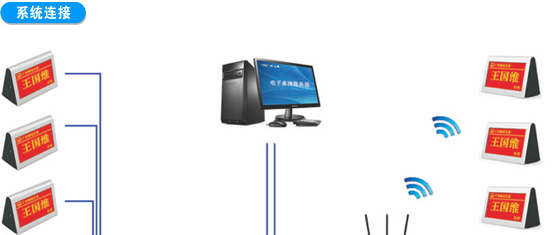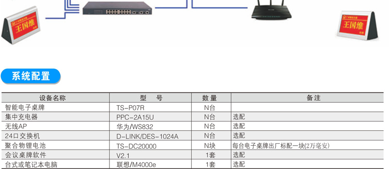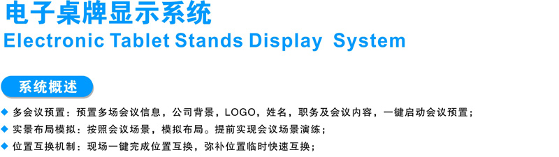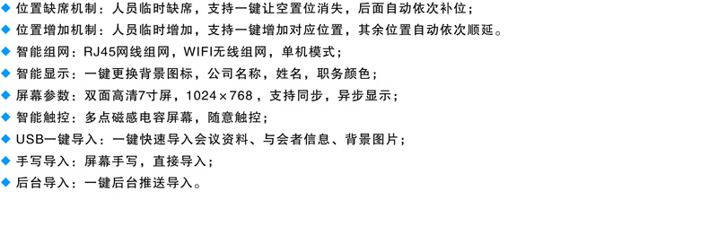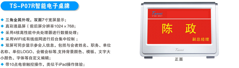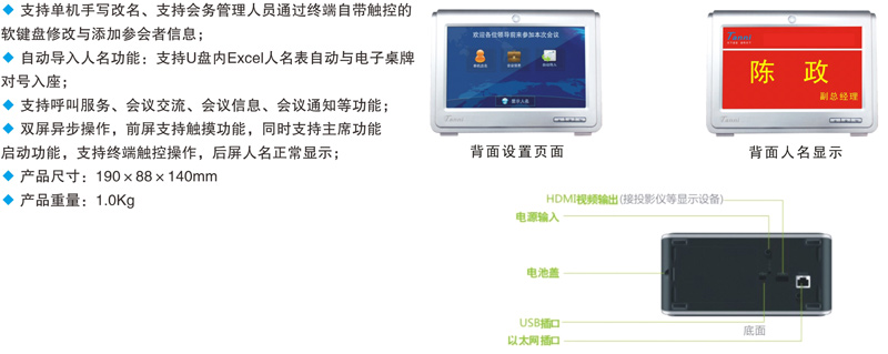 多会议预置:预置多场会议信息,公司背景,LOGO,姓名,职务及会议内容,一键启动会议预置。 智能组网:RJ45网线组网,WIFI无线组网,单机模式。 智能显示:一键更换背景图标,公司名称,姓名,职务颜色。 屏幕参数:双面高清7寸屏,1024×768 ,支持同步,异步显示。