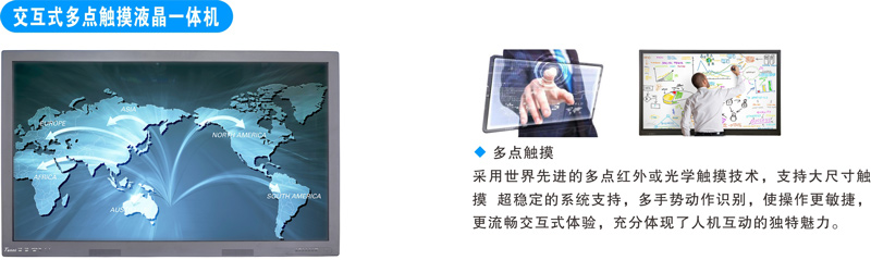 集成了LED 电视、平板电脑、音响、投影仪、交互式电子白板等设备功能,呈现出LED 背光,超轻超薄、超低功耗、无热干扰、超低辐射等亮点。改善了传统设备造成的复杂接线工程、受环境光影响严重、显示画面不清晰、书写有阴影、使用热干扰和高辐射等弊端和缺陷。这些技术优势对于学生都具有视力方面的保护,另外也可有效提升沟通效率,改善使用环境。同时随机配备的互动电子白板软件和网络资源平台可实现板书、屏幕录制等交互式应用。