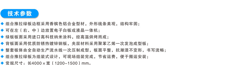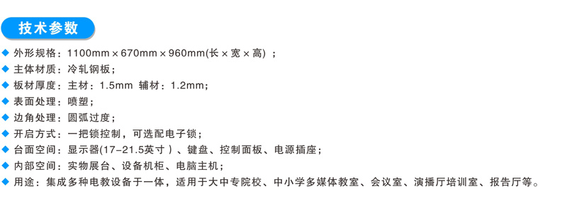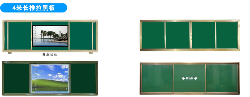 多媒体讲台:又称电子讲台、多媒体电子讲台或者中控讲台,是一种将讲台与电脑、多媒体控制系统、视频展台、音频设备、音视频转换器等电子产品集合为一体的产品。推拉黑板:又称复合黑板是近两年来各地学校比较流行的新式书写板,推拉黑板表面上和普通教学黑板用法是一样的,但推开挡在外面的两块板面后,就出现了交互式电子白板或液晶触摸电视,即可实现电教,推拉黑板的最大作用就在于此:使传统教学与现代教学相结合---书写板与电子白板之间随意切换,安全方便。