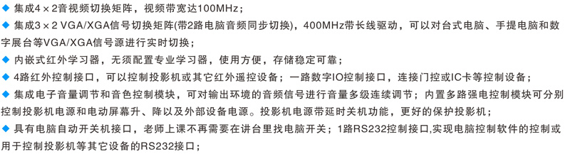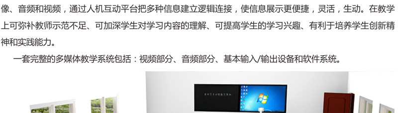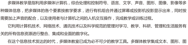 多媒体教学系统由电脑、多媒体软件、数字视频展台、卡座、DVD影碟机、智能中控系统、多媒体讲台、LCD投影机、电动银幕、专业音响系统或者多媒体音箱等多种多媒体教室设备融合在一起形成一个有机的整体,使得多媒体技术在多媒体教学中充分发挥,体现了现代多媒体教学的优点和质量。然后通过智能中控系统将以上各种电教室设备与整个多媒体教学环境有机的结合发挥最大的功能,使授课老师只需轻轻一按,便可轻松操纵整个教学进程,从而有效地提高教学质量。