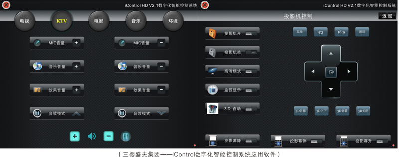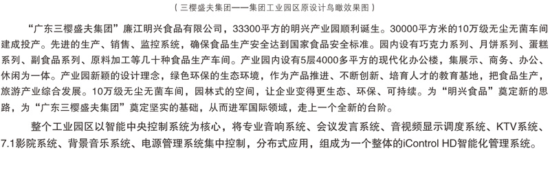 整个工业园区以智能中央控制系统为核心,将专业音响系统、会议发言系统、音视频显示调度系统、KTV系统、7.1影院系统、背景音乐系统、电源管理系统集中控制,分布式应用,组成为一个整体的IControl Hd智能化管理系统。