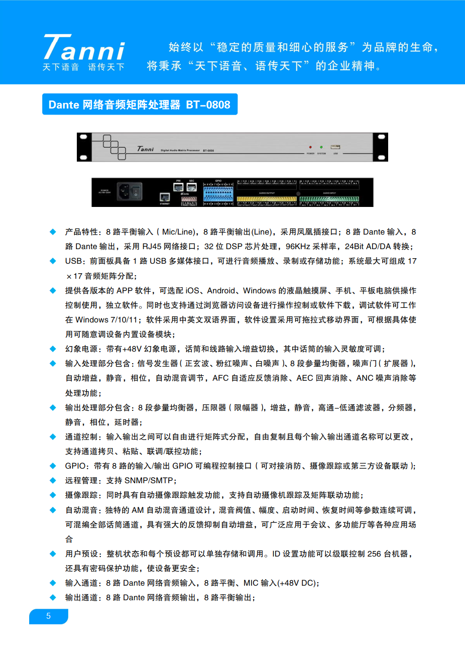 支持8路模拟音频及8路Dante音频输入,通道独立AEC,丰富的处理模块,支持GUI用户网页界面,内置中央控制对系统中的设备集中管控,带USB接口支持音乐播放、录制和腾讯会议、钉钉等软件视频会议等功能!