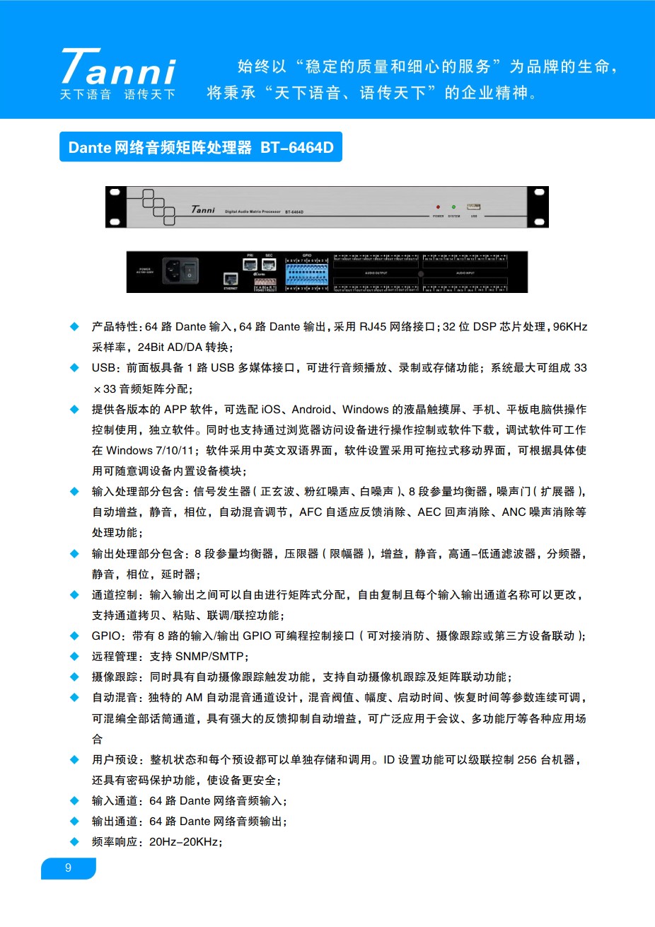 支持64路Dante音频输入,通道独立AEC,丰富的处理模块,支持GUI用户网页界面,内置中央控制对系统中的设备集中管控,带USB接口支持音乐播放、录制和腾讯会议、钉钉等软件视频会议等功能!