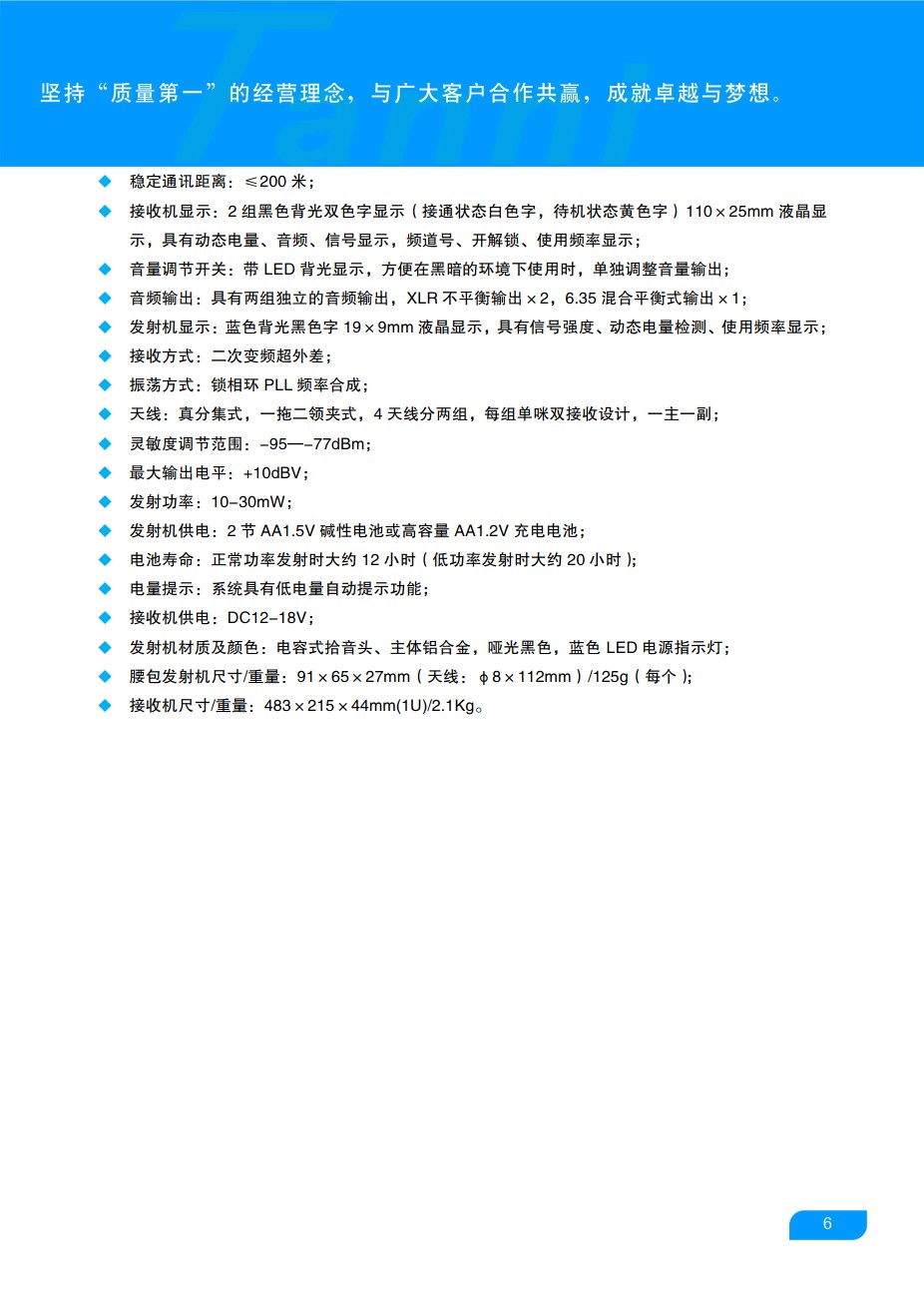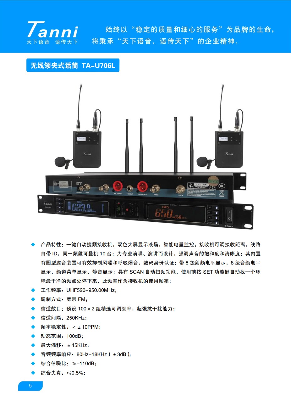 一键自动搜频接收机,双色大屏显示液晶,智能电量监控,接收机可调接收距离,线路自带ID,同一频段可叠机10台;为专业演唱、演讲而设计,强调声音的饱和度和清晰度;其内置有圆型滤音装置可有效抑制风噪和呼吸爆音,数码身份认证;带8级射频电平显示,8级音频电平显示,频道菜单显示,静音显示;具有SCAN自动扫频功能,使用前按SET功能键自动找一个环境最干净的频点处停下来,此频率作为接收机的使用频率。