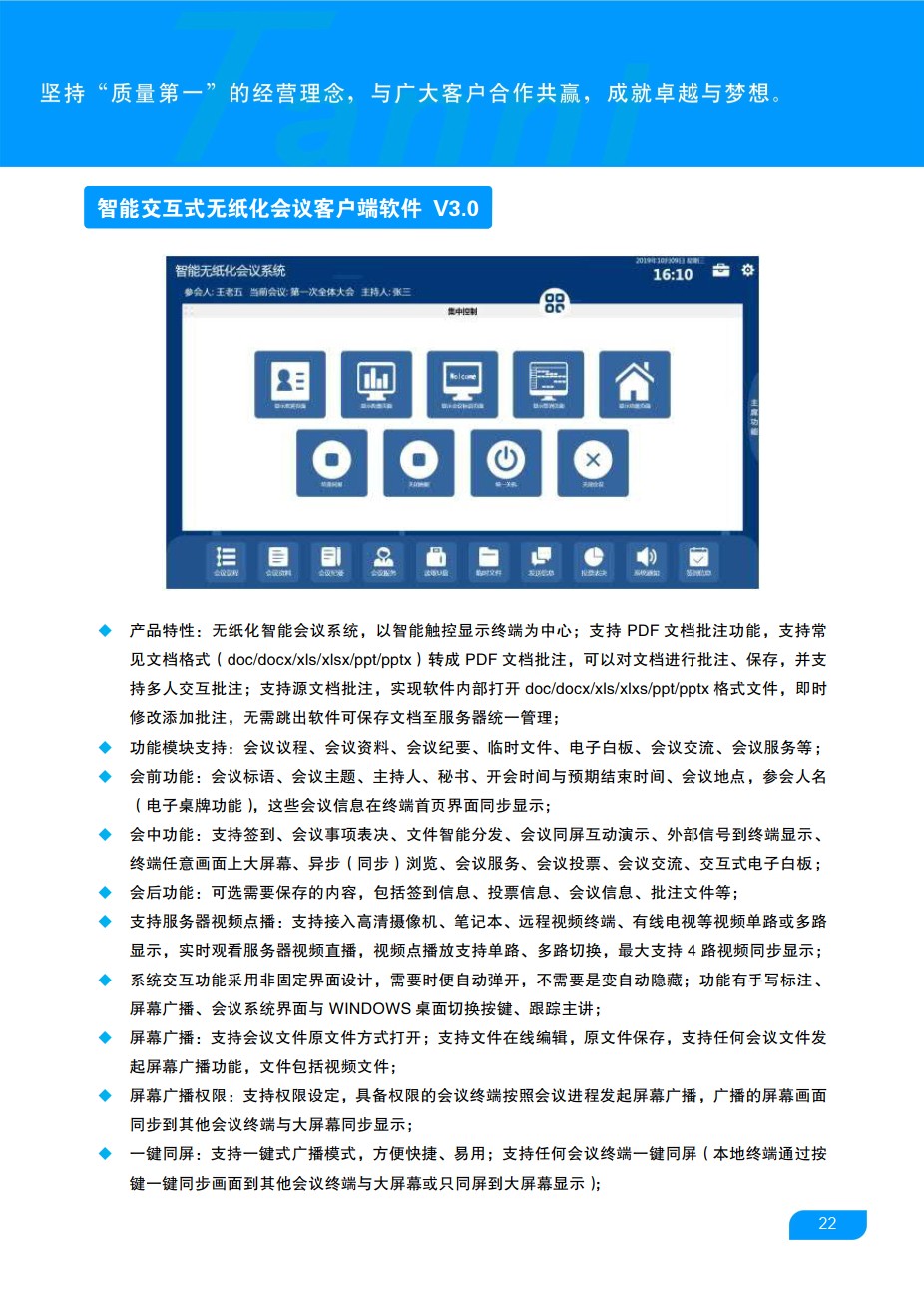 无纸化智能会议系统,以智能触控显示终端为中心;支持PDF文档批注功能,支持常见文档格式(doc/docx/xls/xlsx/ppt/pptx)转成PDF文档批注,可以对文档进行批注、保存,并支持多人交互批注;支持源文档批注,实现软件内部打开doc/docx/xls/xlxs/ppt/pptx格式文件,即时修改添加批注,无需跳出软件可保存文档至服务器统一管理。