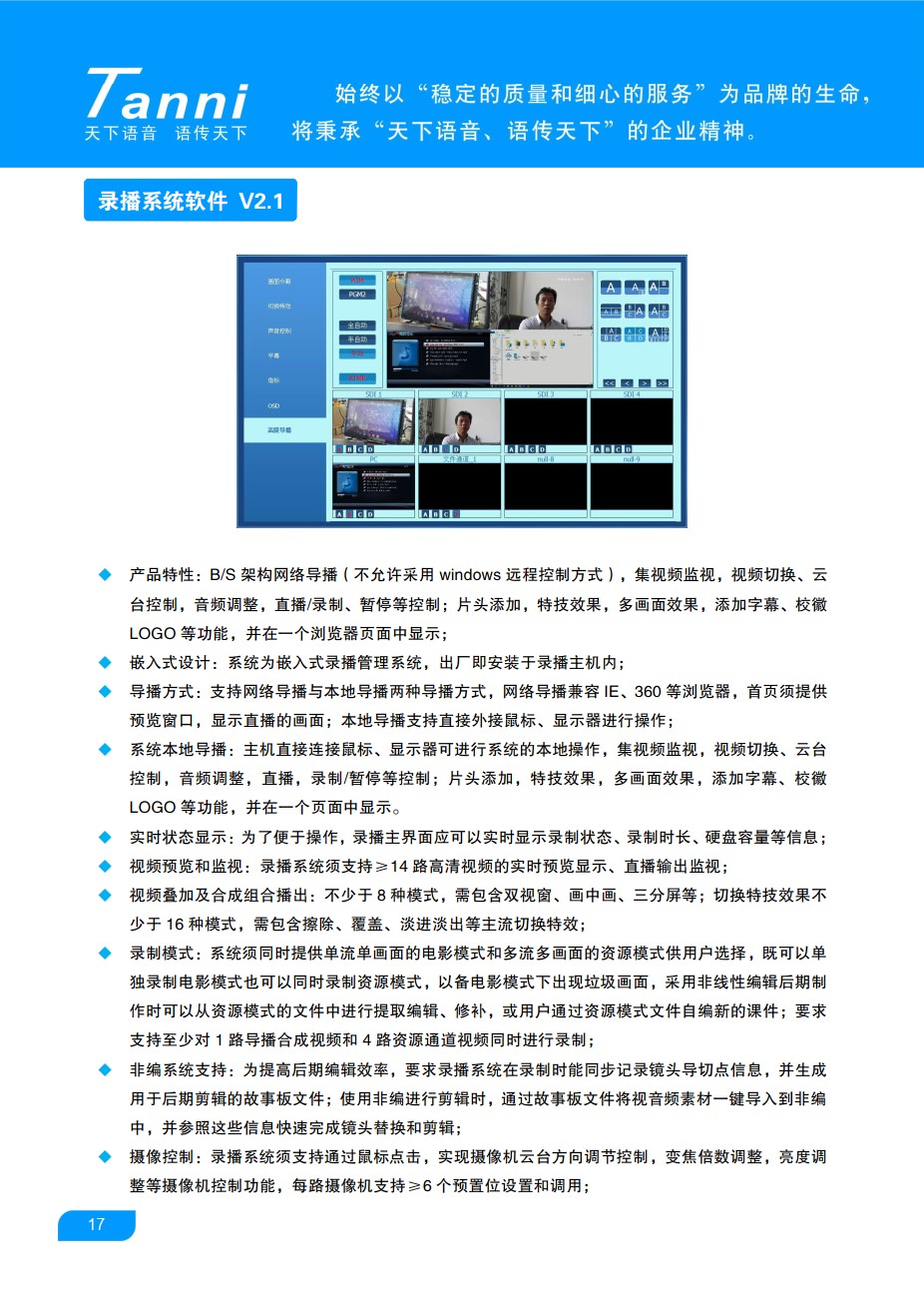 B/S架构网络导播(不允许采用windows远程控制方式),集视频监视,视频切换、云台控制,音频调整,直播/录制、暂停等控制;片头添加,特技效果,多画面效果,添加字幕、校徽LOGO等功能,并在一个浏览器页面中显示。