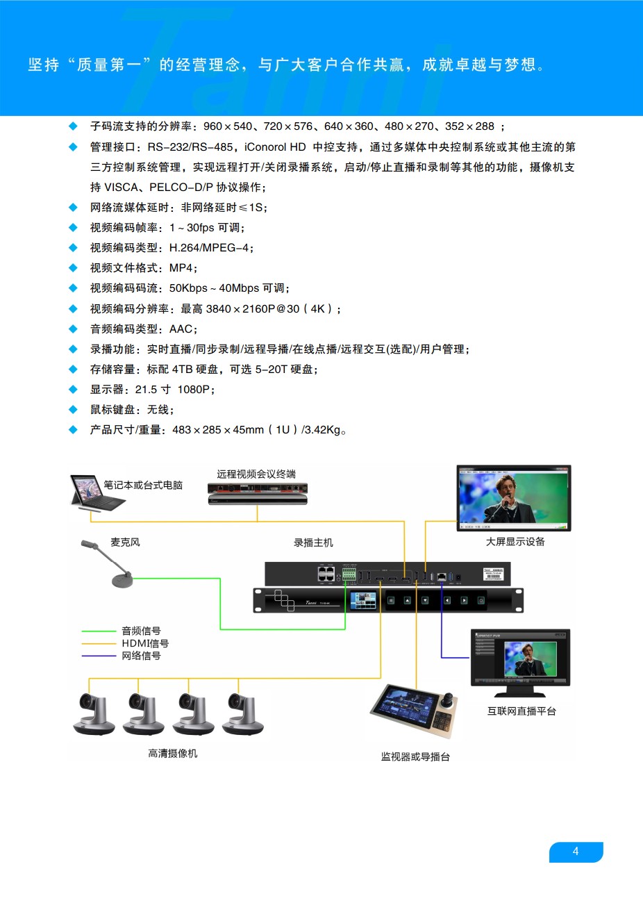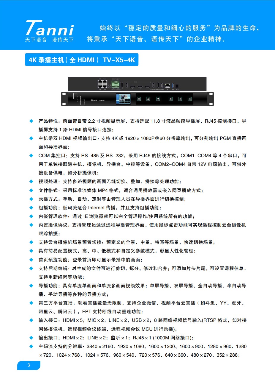 5路HDMI输入,2路HDMI输出;前面带自带2.2寸视频显示屏,支持选配11.8寸液晶触摸导播屏,RJ45控制接口,导播屏支持1路HDMI信号接口连接。