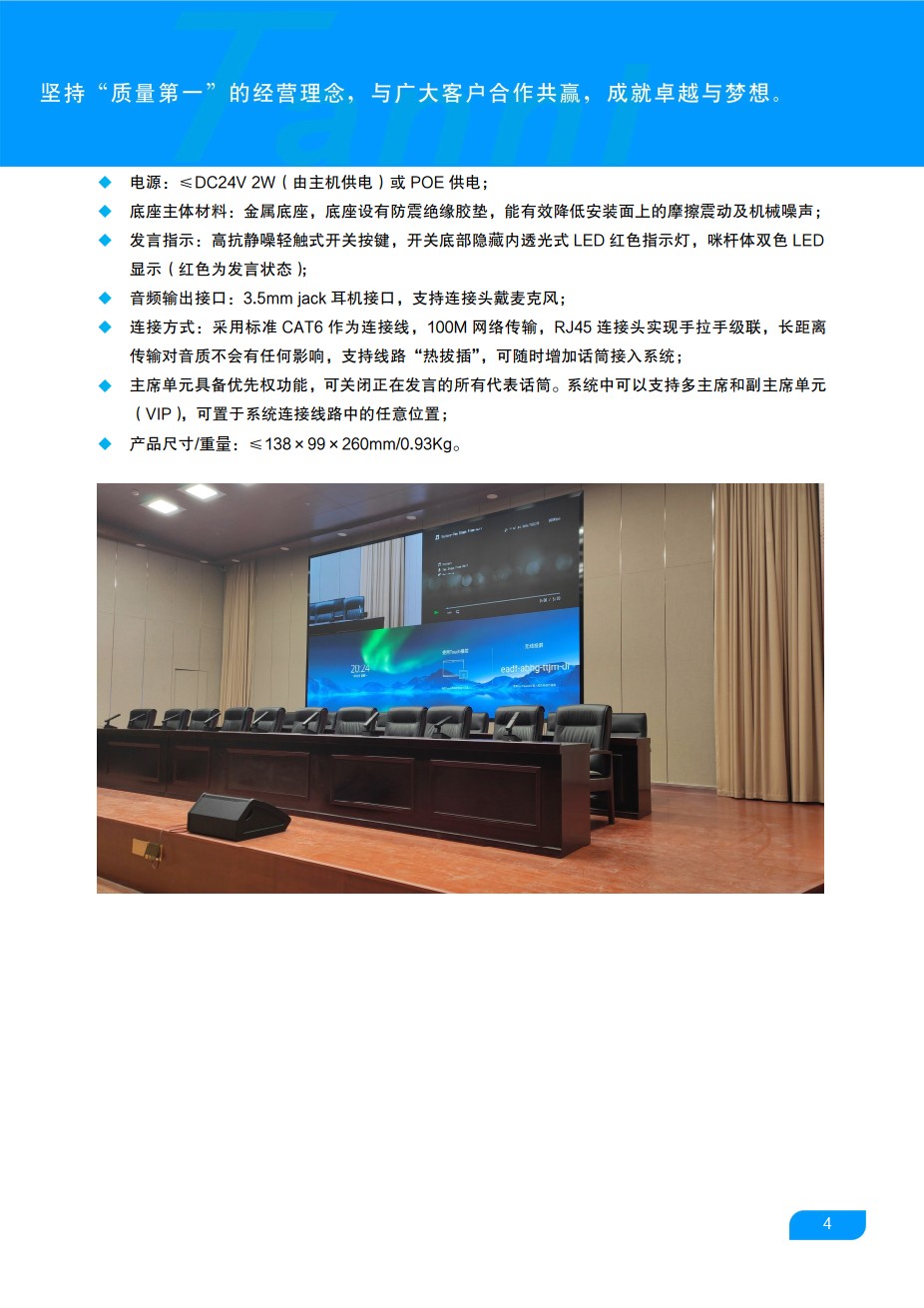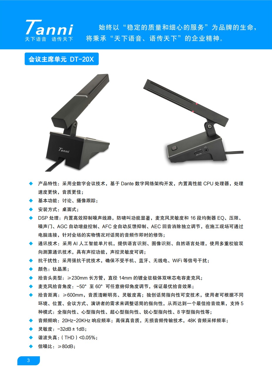 采用全数字会议技术,基于Dante数字网络架构开发,内置高性能CPU处理器,处理速度更快,音质更佳;600mm拾音距离,音质清晰明亮、灵敏度高;独创话筒指向性可变技术,使用者可根据不同环境、位置、会议方式、演讲者的需求来调整话筒的指向性,从而达到一个最佳拾音效果,支持5种模式:全指向性、心型指向性、超心型指向性、锐心型指向性、8字型指向性等。