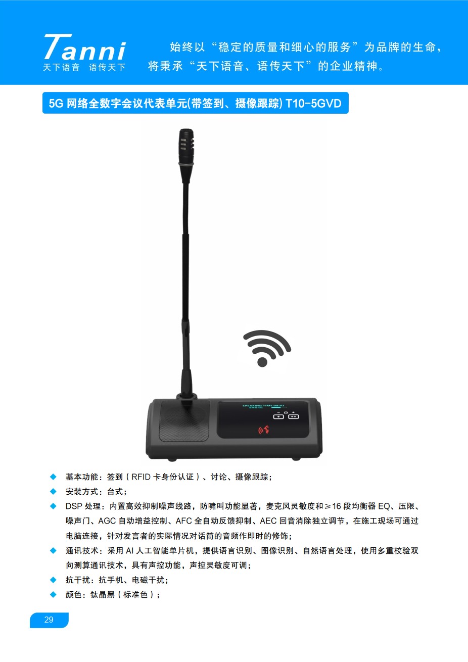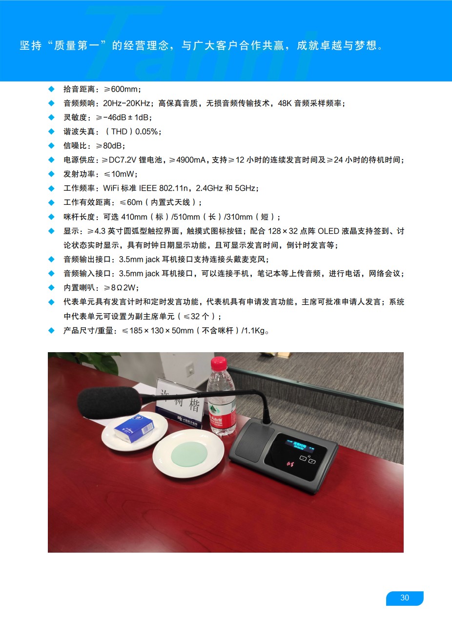 WiFi标准IEEE 802.11n,2.4GHz和5GHz;4.3英寸圆弧型触控界面,触摸式图标按钮;配合128×32点阵OLED液晶支持签到、讨论状态实时显示,具有时钟日期显示功能,且可显示发言时间,倒计时发言等。