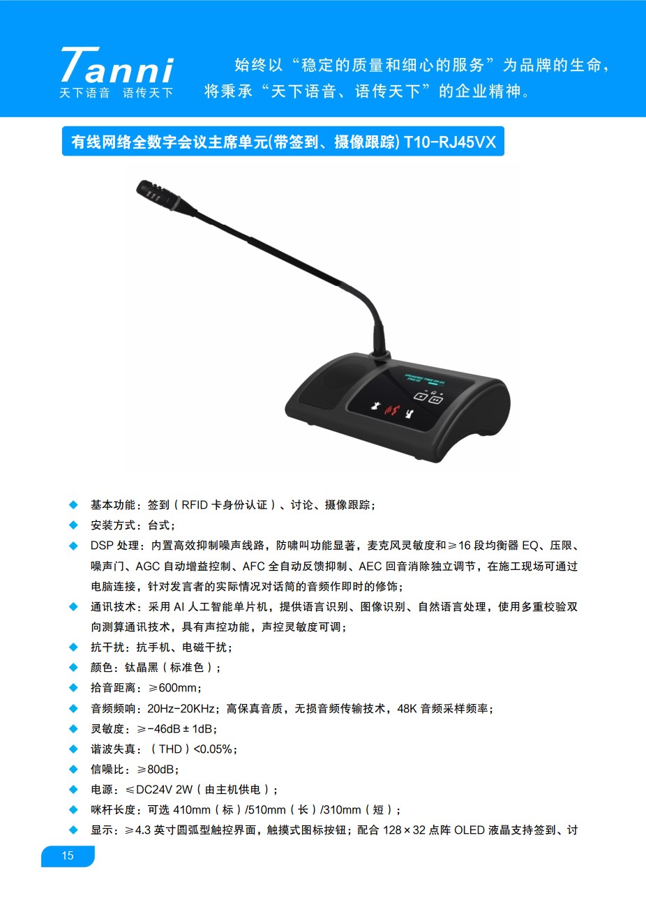 T10-RJ45VX网络全数字会议主席单元(带签到、摄像跟踪)
