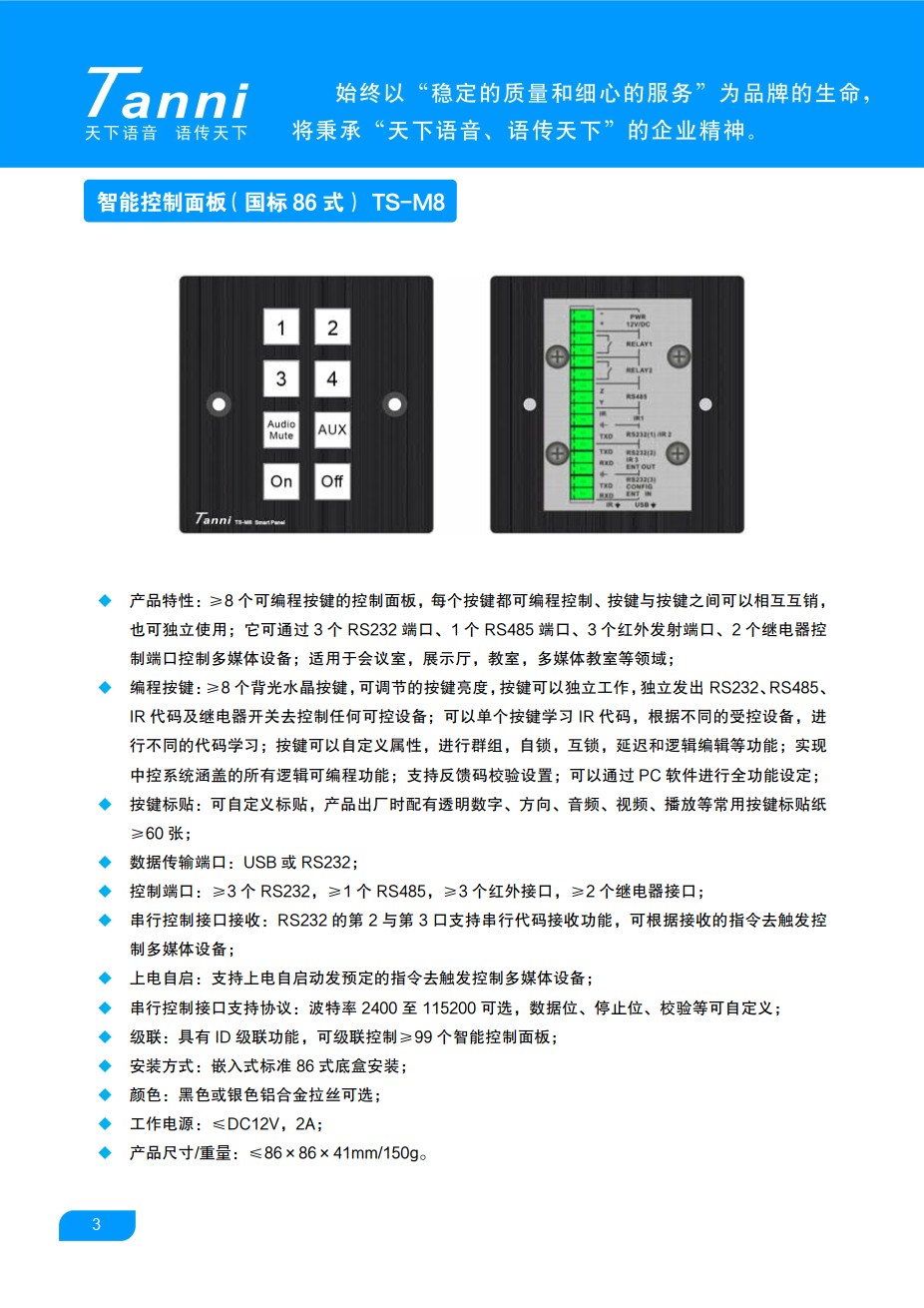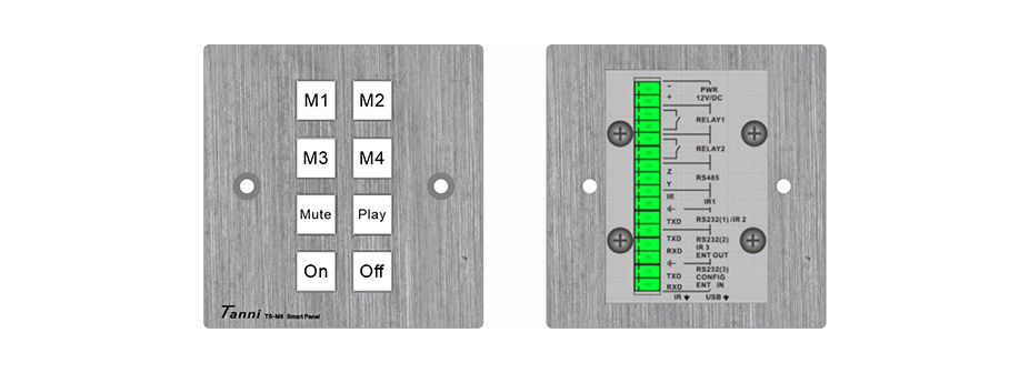 8个可编程按键的控制面板,每个按键都可编程控制、按键与按键之间可以相互互销,也可独立使用;它可通过3个RS232端口、1个RS485端口、3个红外发射端口、2个继电器控制端口控制多媒体设备;适用于会议室,展示厅,教室,多媒体教室等领域。